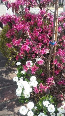 芝生が休眠から覚めて元気に青々としてきて、桜の花とのコントラストが美しい。トキワマンサクも満開になり、深紅の花をつけている。昨年から真白の花も加わった。椿も満開であり、赤と白の花をいっぱいつけている。平戸つつじ、皐月、霧島つつじも、もうすぐ咲く。